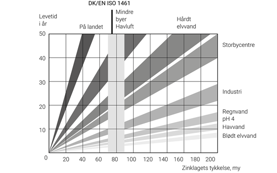 Diagrammet viser middellevetiden for zinklag i forskellig tykkelse i bestemte miljøer.