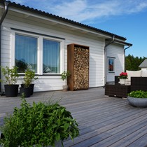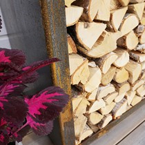 Elegant brændeopbevaring, som med fordel kan bruges som afskærmning. Udsparinger findes i den indrykkede bagkant med mulighed for forankring i væggen.