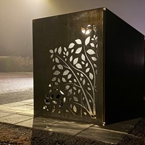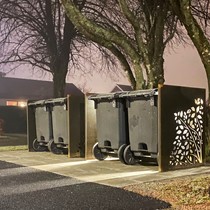 Designede skraldespandsskjulere, der skiller sig ud fra mængden, uafhængigt af møntret. Skraldespandsskjuleren fås i tre forskellige størrelser og vælges alt efter størrelsen på skraldespanden. Alle kanter er indrykket, hvilket gør udtrykket mere eksklusivt. Desuden er skraldespandsskjuleren udstyret med en skjult inderliste med mulighed for at isætte sin egen belysning. Belysningen giver et smukt lysbillede, når mørket falder på. I den bøjede underkant er der også mulighed for eventuelle jordspyd efter behov. Leveres i tre dele til egen montering.