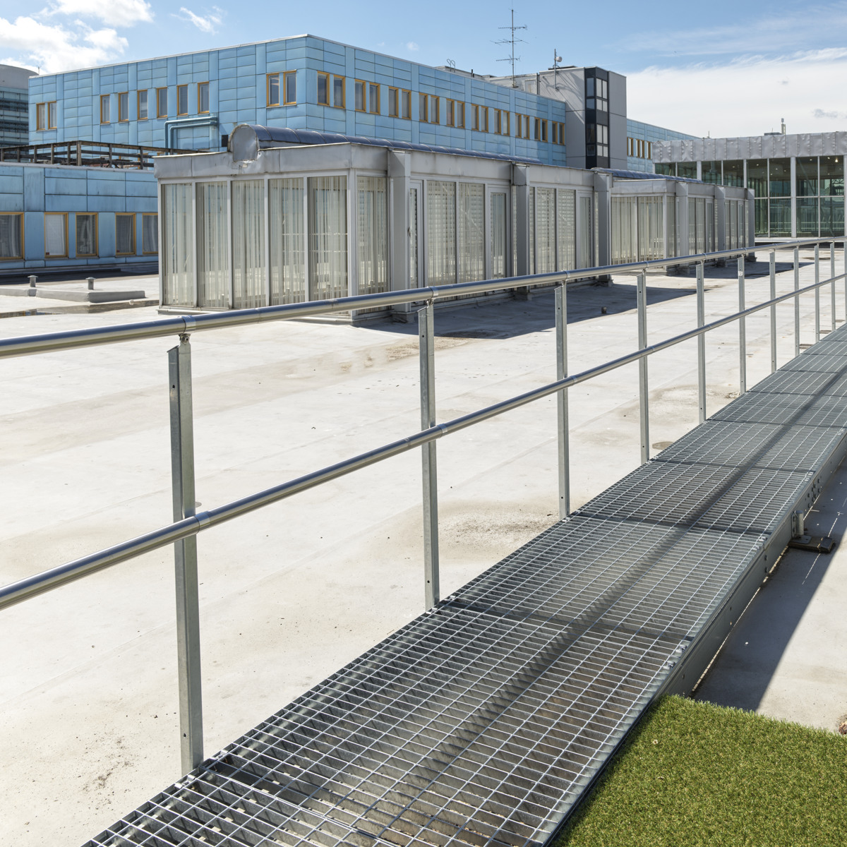 Gelænder i tæt eller perforeret metalplade. Børnesikkert med en maksimal åbning på 100 mm.