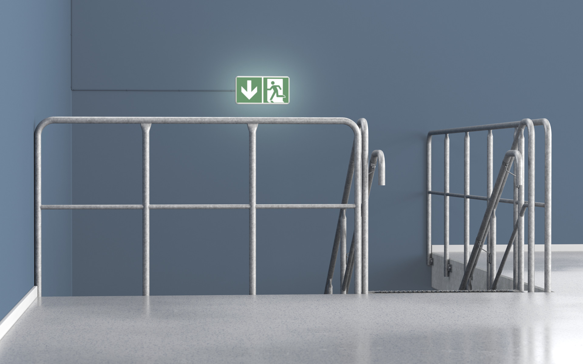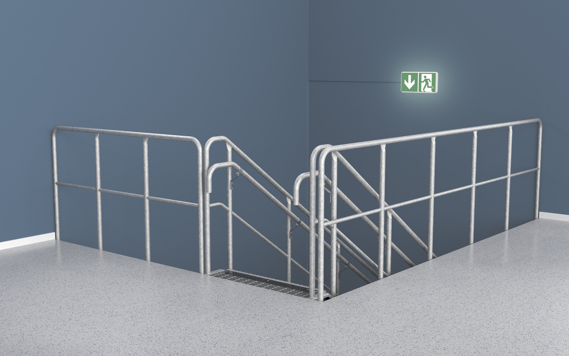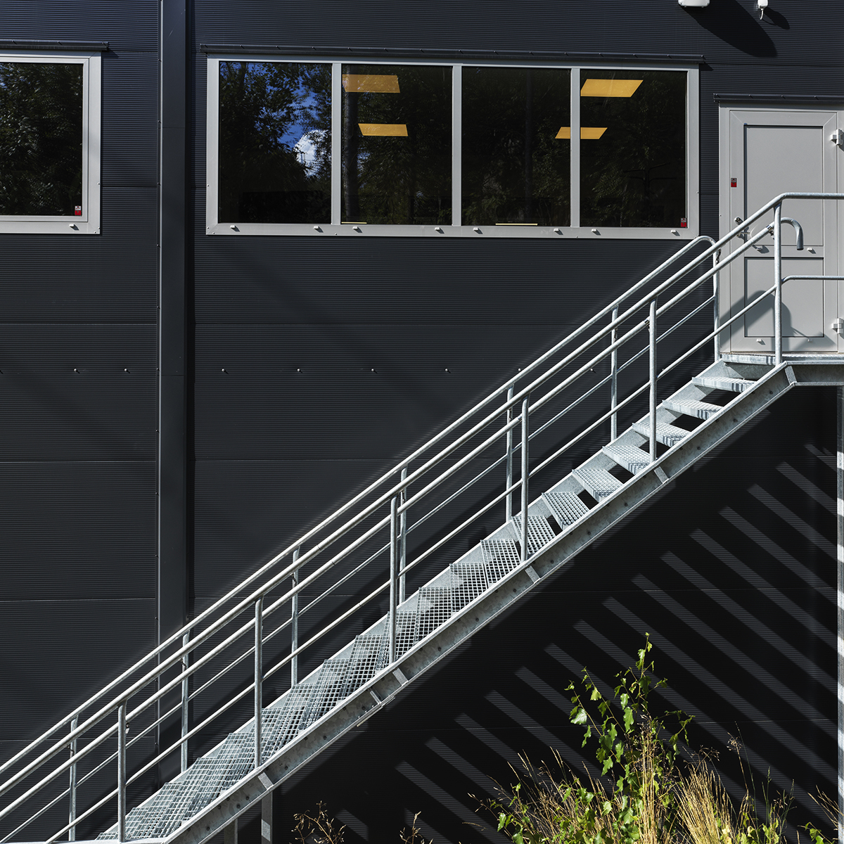 Håndliste og balustre af rør ø 42 mm, en knæliste af rør ø 28 mm – standard på industritrapper.