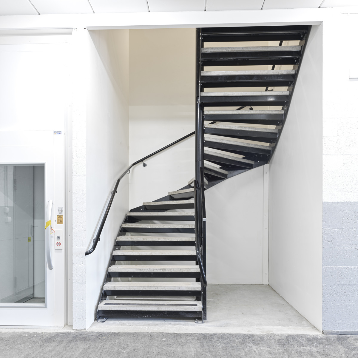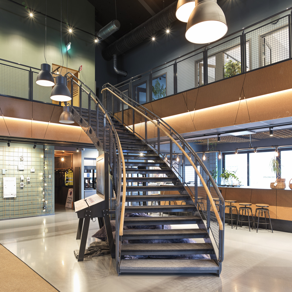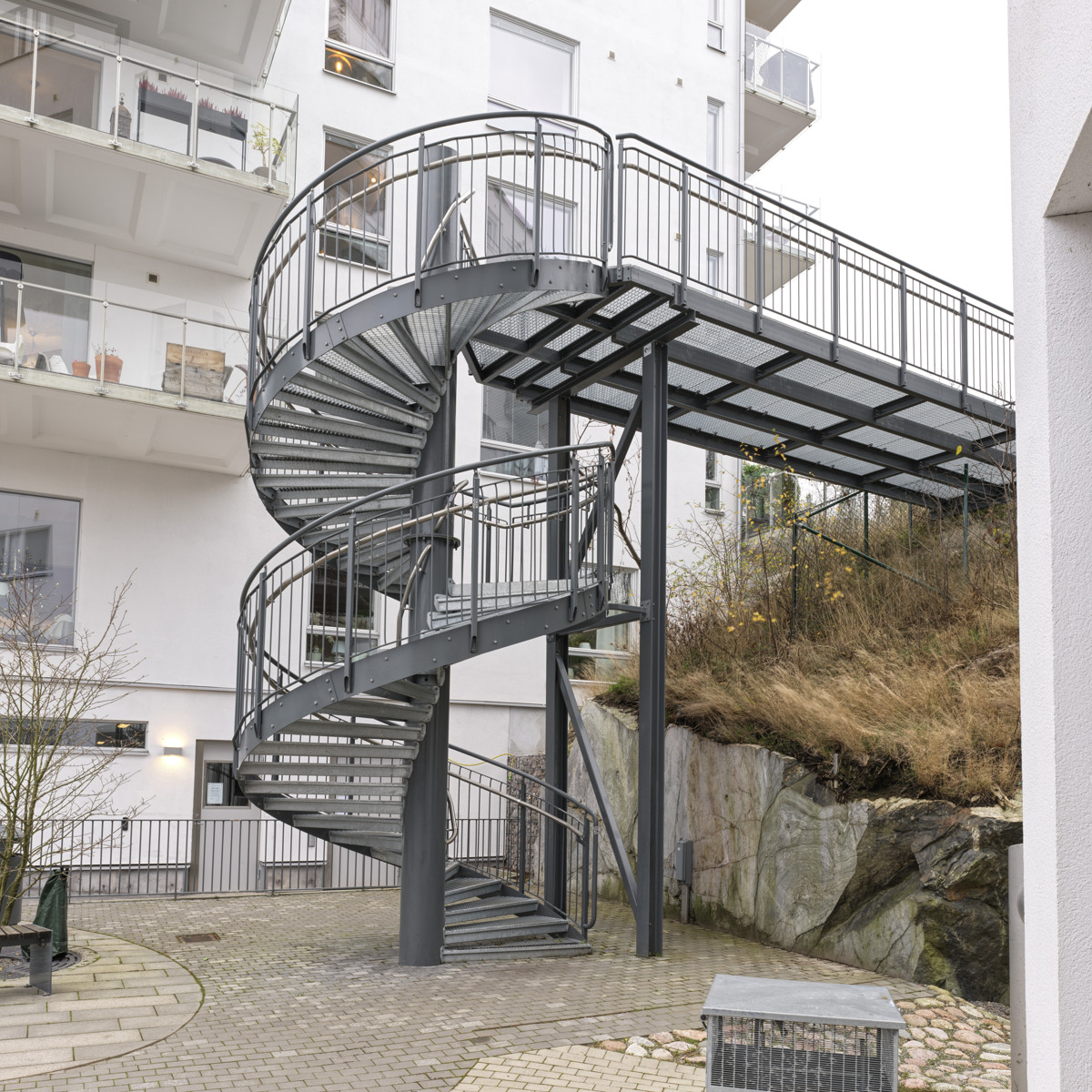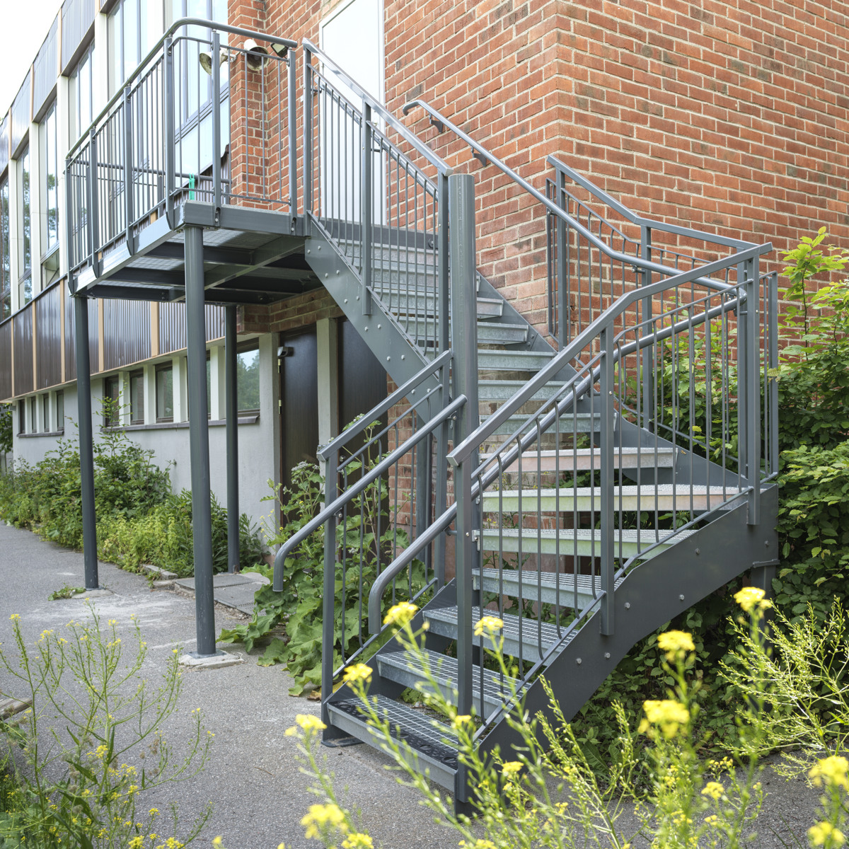 Welands kombitrappe er en kombination af en ligeløbstrappe og en spindeltrappe. I den svungne del af trappen fremstiller vi trin, så de på følger trappens radius. De kombineres med trin og gelændere fra vores standardsortiment.