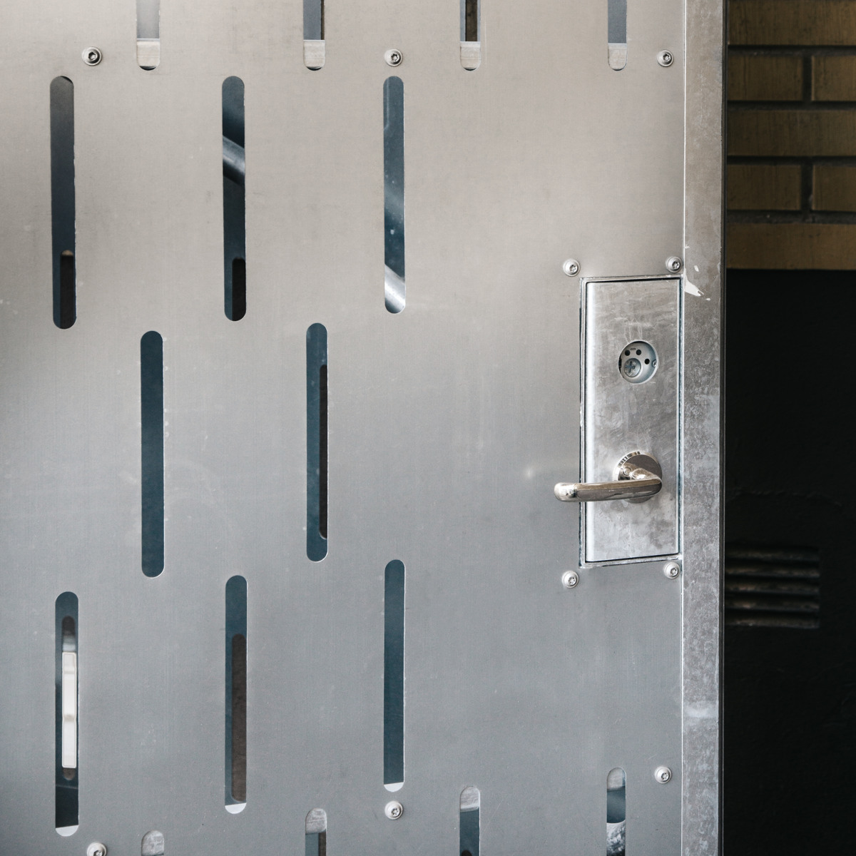 Sikkerhedsbure i gitterrist kan også fremstilles højere end standardhøjden og følge hele trappens højde. Burets udvendige radius er 130 mm større end trappens radius. Døren forsynes som standard med lås ASSA 410-50 hagerigel, men kan også udstyres med ASSA 722 med nødevakueringsbeslag og ASSA 732 med nødevakueringsbeslag. Dørhåndtag på begge sider. Dørhåndtag på begge sider. Døren til buret åbnes med nøgle udefra og håndtag indefra. Et andet egnet materiale til trappebeklædning er perforeret plade, som kan fås i en række forskellige standardmønstre. Kundetilpassede mønstre kan også tilbydes.